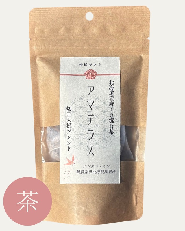 「アマテラス – Hemp Flow Tea – 切干大根ブレンド」は、太陽のめぐみを感じる、やさしい一杯。大地の恵みとヘンプの融合で、やさしく内側から巡りをサポートします。 北海道産の自然栽培・農薬不使用の麻茎に、天日干しされた切干大根をブレンド。 麻のミネラルに加え、切干大根にはカリウム・食物繊維・ビタミンB群などが豊富に含まれ、麻の持つ巡りの力と相乗効果を生み出します。 ほんのり甘みと香ばしさを感じる味わいは、食事との相性も良く、温めても冷やしても美味しく楽しめるブレンドティーです。 1包で、たっぷり1リットル分のティータイムを楽しめます。 カフェやサロンのメニューとしてほっこりすると人気の商品です(写真:日本茶カフェ茶とあんさんありがとうございます♪)。 【おすすめシーン】 ・冷えやむくみが気になる時に ・女性の体調サポートとして ・汁物がないときの温めに ・カフェのメニューに 毎日のティータイムに内側から整う時間をお楽しみください。